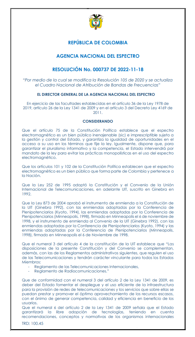 2022年11月18日,哥倫比亞國家頻譜局修改了2020年第105號(hào)決議,更新了國家頻段分配表,并根據(jù)新的第000737號(hào)決議將6 GHz頻段(5925 - 7125 MHz)釋放給室內(nèi)使用。